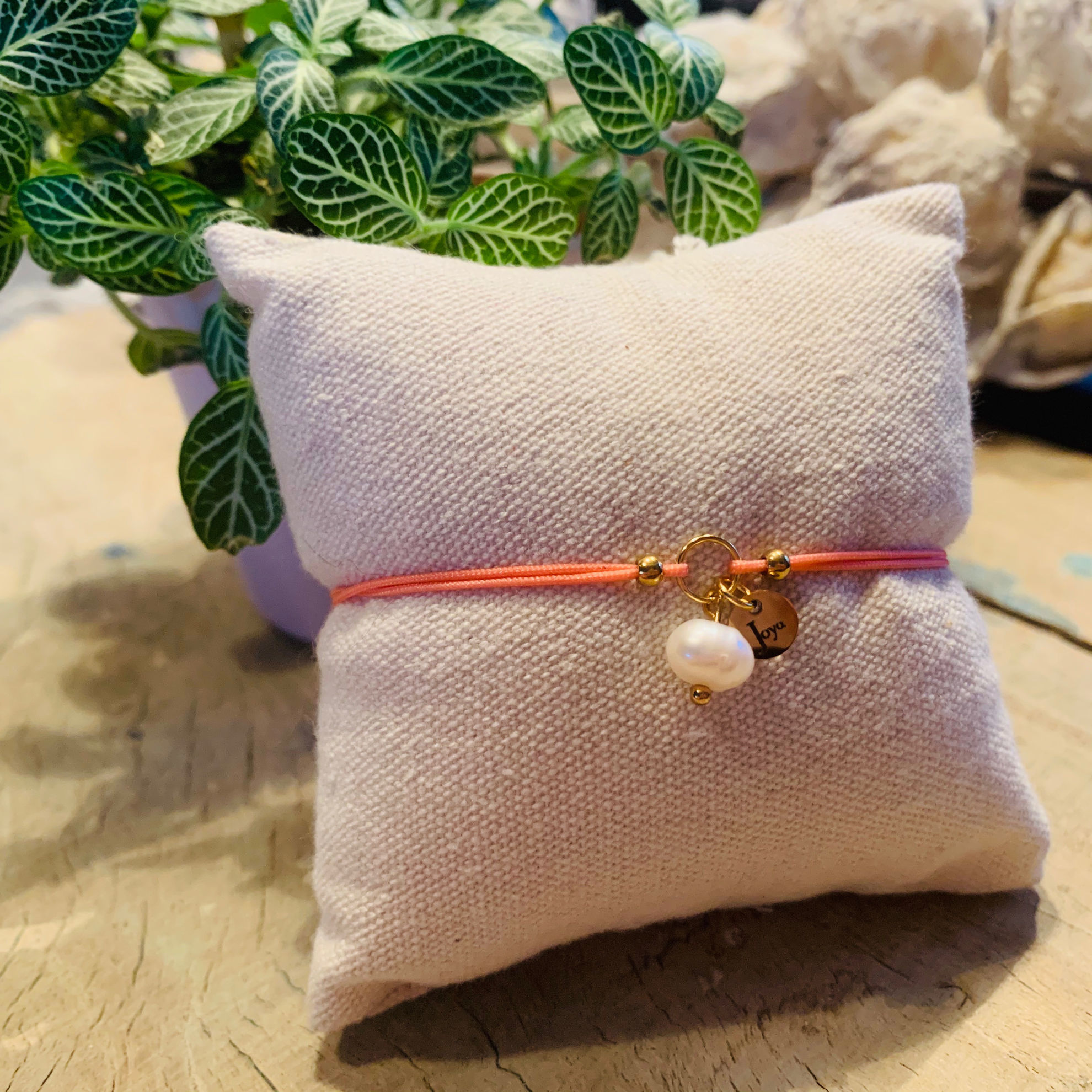 Leuk armbandje met bedeltje in stainless steel en zoetwaterparel. Touwtjes in Peach of Koraal kleur.One size fits all, met een schuifknoopje.