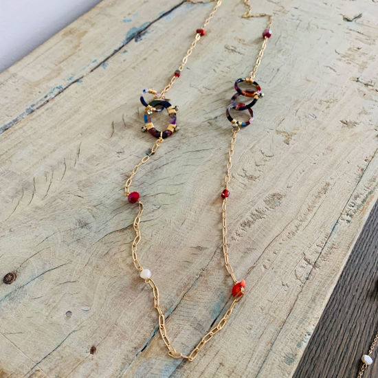 Mooie lange ketting in stainless steel met verschillende kleuren, hoofdzakelijk rode tinten.Op de foto zie je de kortste stand, nog met verlengkettinkje.