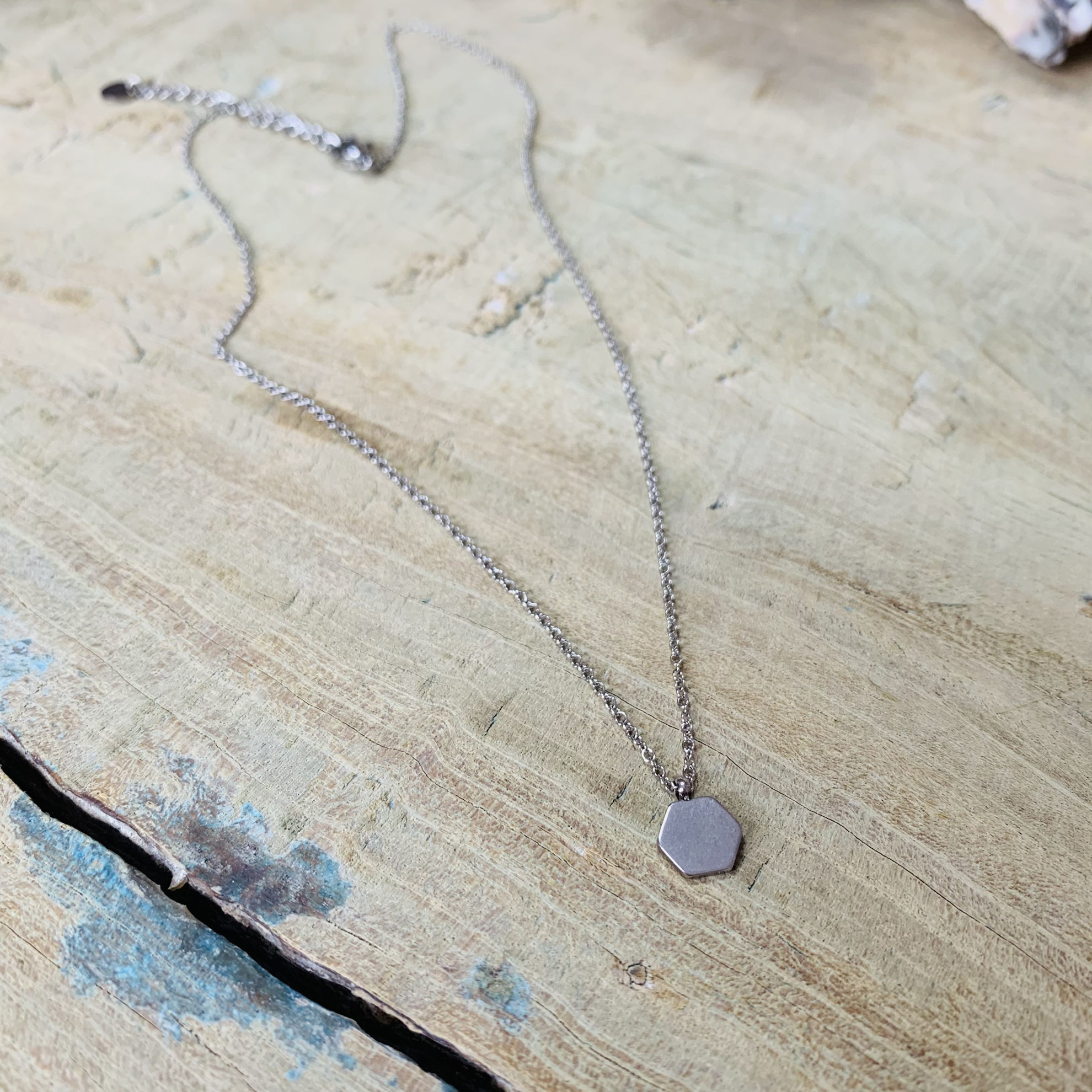 Deze ketting is gemaakt in stainless steel. Het hangertje is een fijn zeshoekje met een afmeting van 8mm.De ketting heeft een lengte van 40cm met een extra verleng kettinkje van 5cm.